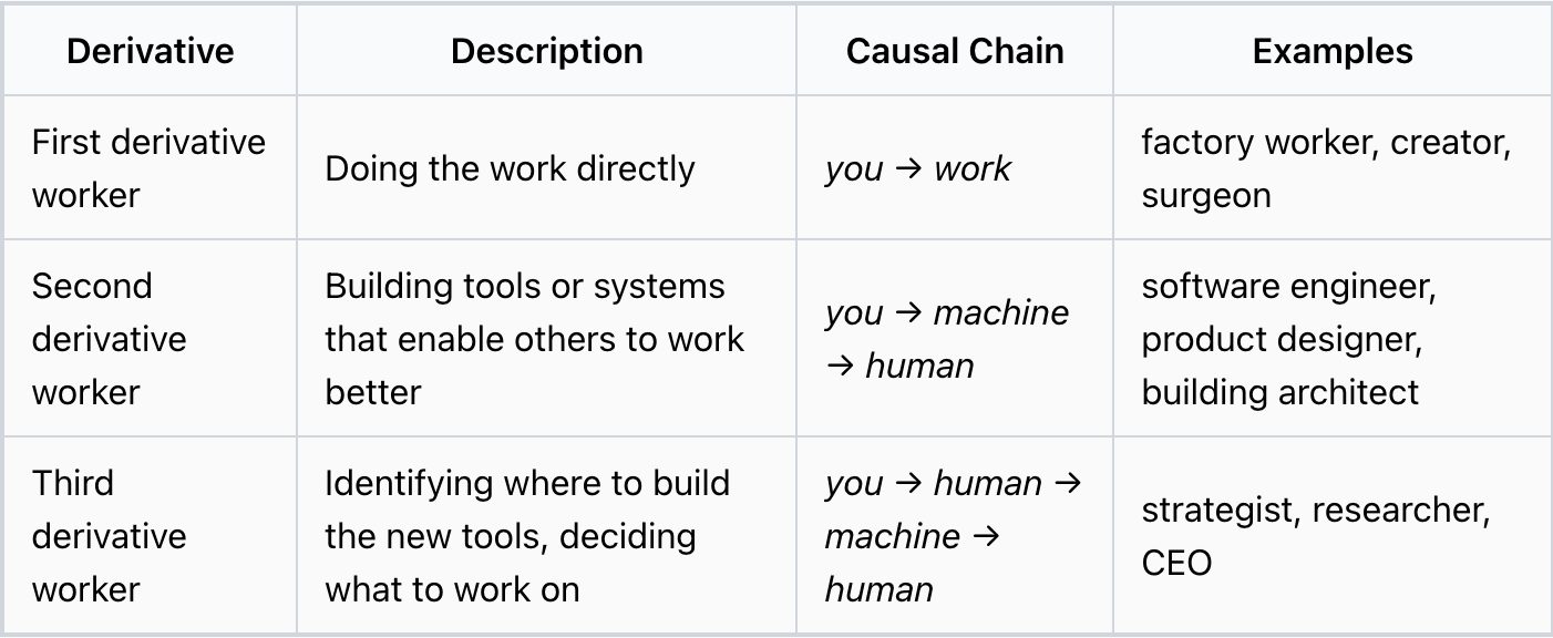 In a previous post, I outlined a theory of "derivative levels" as a way to understand why certain roles and types of work are highly compensated.